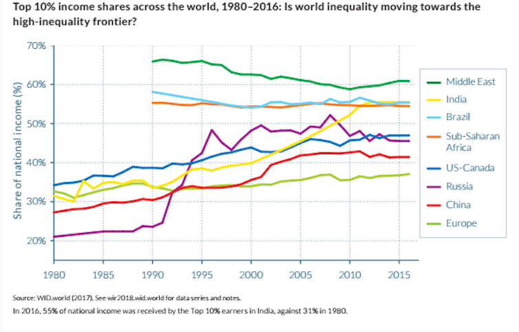 Since 1980, the report shows that there has been rising inequality occurring at different speeds in most parts of the world. This is measured by the top 10% share of income distribution – how much of the nation’s income the top 10% of earners hold.