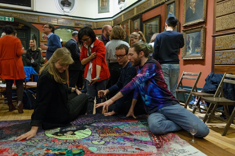 We call our art-science collaboration #MagicCarpet. The artist attends scientific seminars and takes part in ADHD research trials, while the psychiatrist enters spaces like the South London Gallery and the Southbank Centre, to talk with arts audiences and professionals. A key output of our project is a tapestry art installation, which people can sit on to chat and make drawings about their mind (you can make your own here). #MagicCarpet is a creative space for people to discuss their own mental health and mental health more generally. We invite people from all walks of life, including ADHD experts and service users, psychiatry-sceptics and health professionals, to discuss mental health.