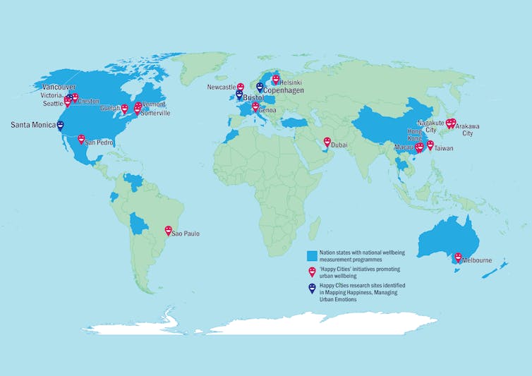 Most recently, New Zealand announced that its 2019 budget will report on how national spending impacts on well-being. City authorities are developing “smart” approaches to measuring happiness, mobilising an ever-increasing array of mobile apps and behavioural data that aim to sense, map and explain our daily happiness. For example, the Smart Dubai Office launched their Smart Happiness Index earlier in 2018, which promises to assess the performance of their city managers based on happiness gain per funds spent.