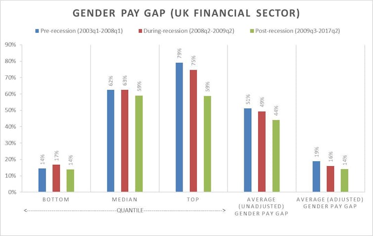 Indeed, overall, we found there to be only a marginal decline in the pay gap since the recession – rather than a radical change. Our study exposed differences between groups, with the gender pay gap substantially higher among the financial industry’s highest earners. Between 2009 and 2017 the gap ranged from 13.8% among the lowest earners (that is, at the 10th quantile) compared to 58.6% among the highest earners (90th quantile), resulting in the irony that the more successful the woman, the greater the pay gap between her and her male counterpart.