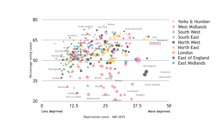 Overall, 52% of people voting Leave in all of the UK lived in the southern half of England – home to a minority of the UK electorate – and a majority of these Leave voters were in the middle classes. At a local authority district level, there was essentially no correlation between voting Leave and deprivation, which shows that the driving force behind the vote to Leave was not being left behind other areas.