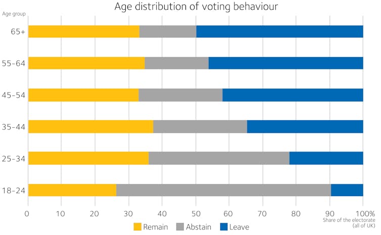 Age was the most important factor in the Brexit decision, with a majority of those over 45 voting to leave, rising to more than 60% of those aged over 65. Incidentally, people aged over 90 – old enough to clearly remember World War II – tended to be very pro-Remain, but their numbers are now inevitably small.