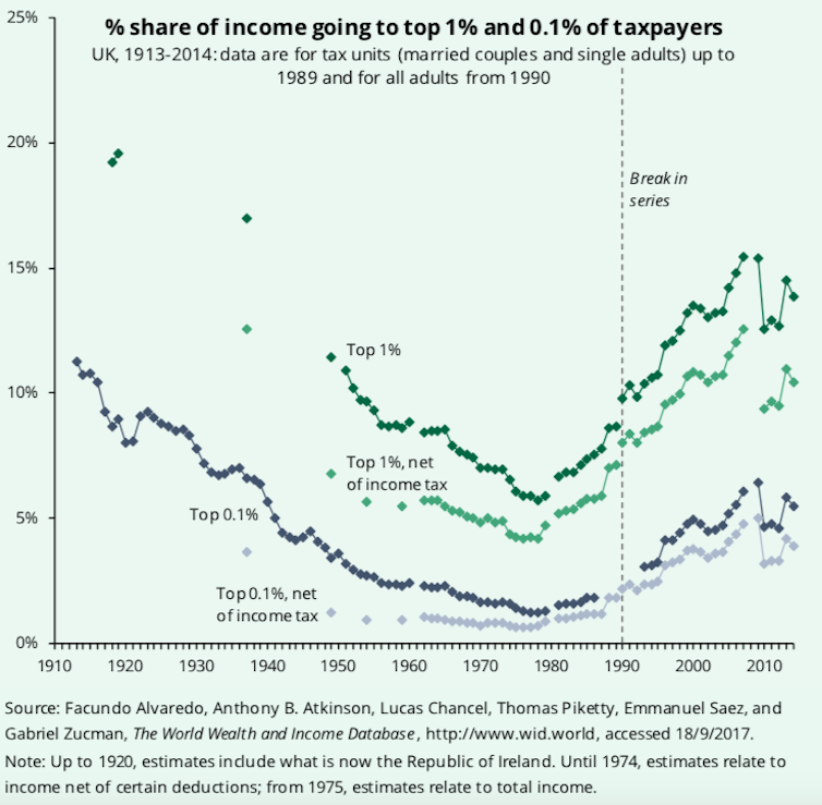 In 1913, the richest 0.01% of households in the UK received 425 times the average household income per year. By 1976 that had fallen to just 30 times. But by 2014 it had risen to 125 times. Figures for very recent years are yet to be released by the government.