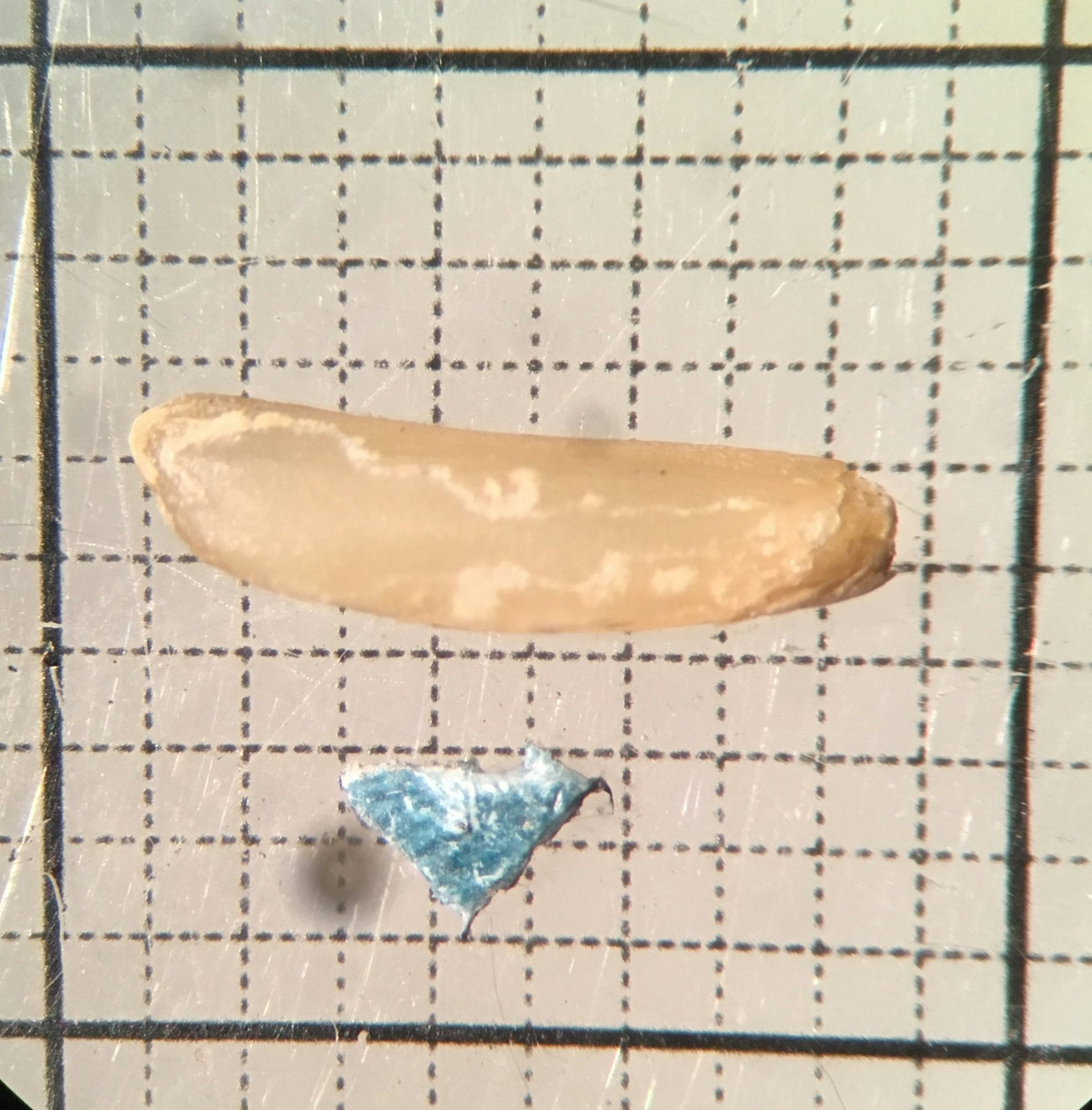 3 mm microplastic particle recovered from the stomach of a fish compared to a 7 mm grain of rice.Alex McGoran, Author provided